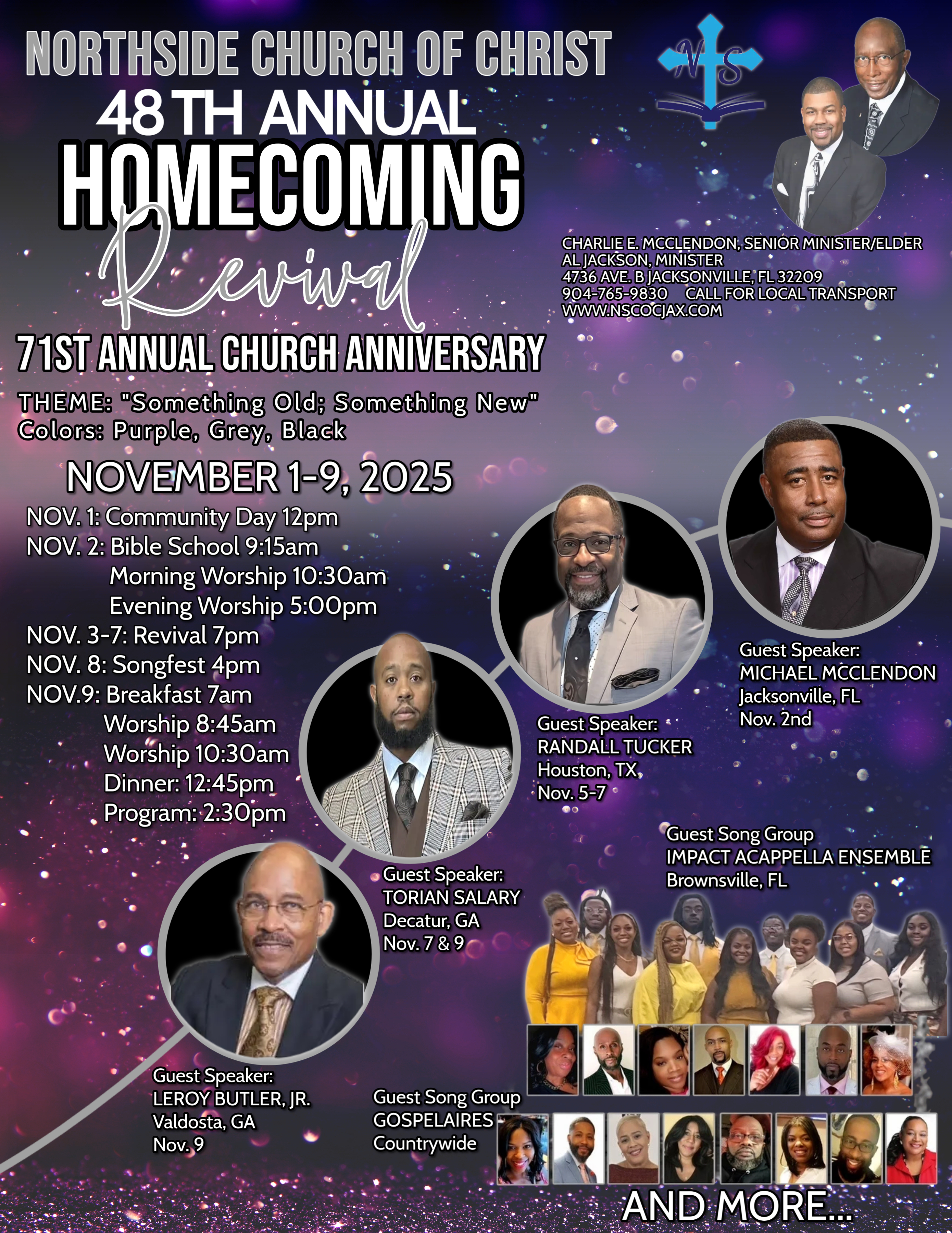 We are a congregation of the churches of Christ established by Jesus Christ in A.D. 33. Our mission is to save souls and help souls stay saved. Welcome to the Northside Church of Christ. With this in mind, we take evangelism very seriously. It is the core of everything we do (Matthew 28:19-20). We are a New Testament church and our plea is that we all might be one. We seek to carry out this plea by believing and teaching the inspired word of God and expressing 1 John 4:7.